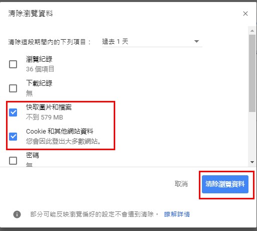 2.请勾选【快取图片和档案】、【Cookie和其他网站资料】,然后按下【清除浏览资料】。