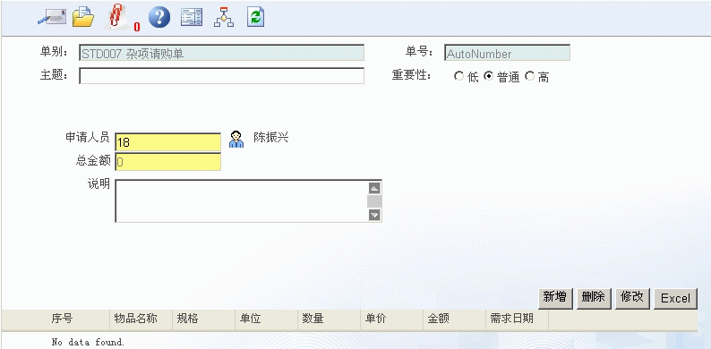 当系统上线之後,所有请购作业,您都可以利用『杂项请购单』提出申请,透过使用电子表单方式提出杂项请购申请,可以为您节省纸上作业所浪费的人力及时间。