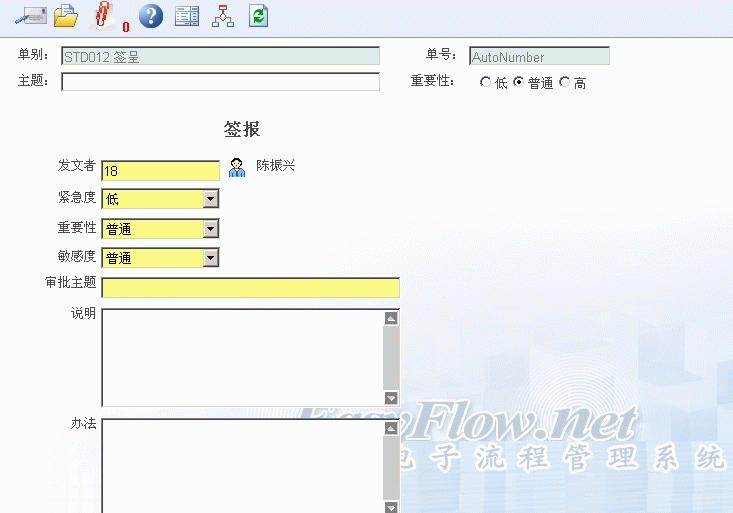 当您有文件须要送请签呈时,可以开启EasyFlow使用本表单填写签呈作业的相关资讯,如:发文者、紧急度、重要性、敏感度、主旨等,将相关资料填妥後,按"传送"就可以将表单传送给流程定义中相关人员的收件匣中等待签核;当您收到结案通知,即可得知该签呈文件是否核准通过。
