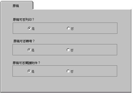这个设定页主要是用来设定有关原稿中有关列印、转寄及可否阅读附件的权限 ,您可以利用这些设定参数,限制或赋予填表人及签核流程中每个关卡的相关签核者是否可以列印、转寄或者是阅读附件的权力。