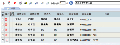 「签核意见」钮主要是用来显示各个关卡及签核者对一份表单的签核详细状况,您可以在点选这个按钮後,查询到一张表单在每一个关卡及签核者的签核状态历史记录,如签核者是谁,读取时间、读取次数、签核的状态等。