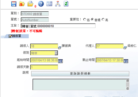 当您有转会的需要时,您可以选择转会功能,首先按下工具列上的”转会”图示,系统将会自动为您复制一份新的表单(如右图)。