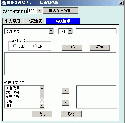 选择您要筛选的栏位,输入条件後,按下[加入]按钮将您所输入的条件加入条件式中。