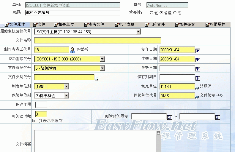 当您欲变更确认一份ISO文件供大家浏览取用,且需要对此文件做版本控管时,填写本表单,经审核单位审核,文管中心赋予文件编号、版号後,系统会将此文件上载至原始文件主机上,再经文管人员发布後,其他人就可以浏览此文件了。 |