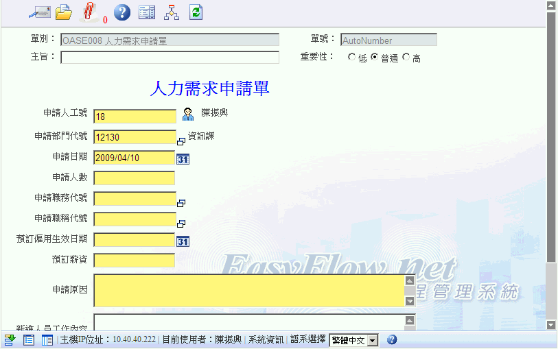 提供公司内部有人力需求时,可以透过此作业申请,以求资讯快速、正确、完整性。