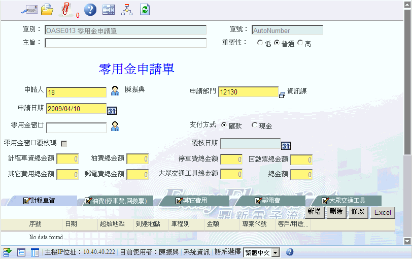 首 页 --> OAS 电子表单清单 --> 零用金申请单