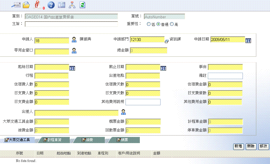 回报国内出差之旅费, 包含大众交通工具费用,计程车资,油费及机票等等.