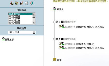 将选定的角色拖拉至流程图中,等流程角色转为蓝色後放开(如右图),您即完成了流程的设定。