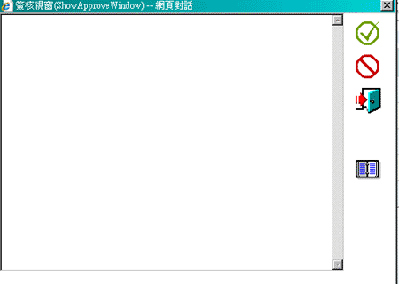 等画面秀出表单後,按"签核"的图示,系统将秀出如下的图示後,您将可对此表单做出准或不准的结果,您也可以在下面的空白视窗中,写入您的任意签核的意见。等画面秀出表单後,按"签核"的图示,系统将秀出如下的图示後,您将可对此表单做出准或不准的结果,您也可以在下面的空白视窗中,写入您的任意签核的意见。