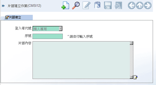 本作业用来建立及维护常用的片语。片语代号可以先依照部门区分或使用种类来进行大分类,之後再加上小分类或代号。在电子表单签核时,可以直接套用已经建立的片语,节省打字的时间。