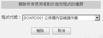 2. 删除所有使用者对於指定程式的权限,画面如下,请由下拉选单中选定要删除使用权限的程式代号,点选「删除」,即删除所有使用者对於该程式之使用权限。