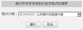 3. 显示所有使用者对於指定程式的权限,画面如下,请由下拉选单中选定要显示使用权限的程式代号,点选「显示」,即显示所有使用者对於该程式之使用权限。