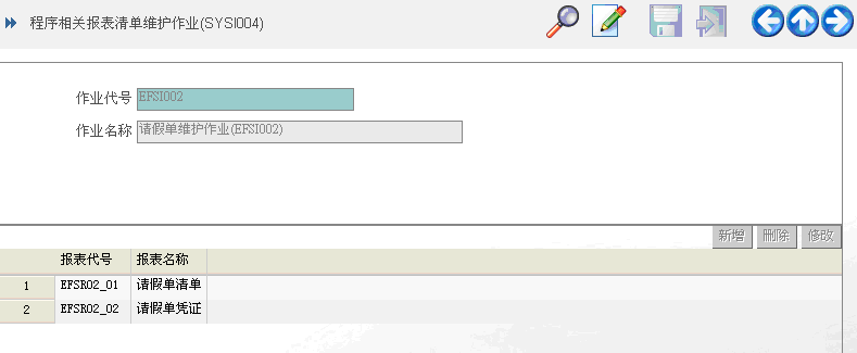1. 在本系统中,每支作业程式均可设定多种报表档以便资料查询或列印,例如「请假单维护作业(EFSI002)」可以选择列印「请假单(EFSI002R01)」或「请假单清单(EFSI002R02)」等两种报表。