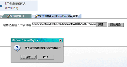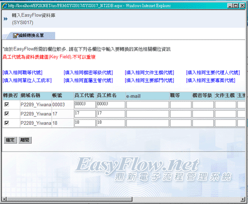 按下转入EasyFlow资料库的按钮後,请将以下画面中的空白栏位填上资料後,按确定钮,则系统将自动把您所选的资料转入资料库内。